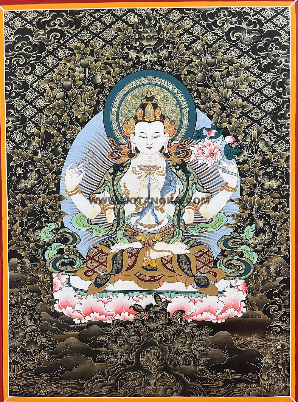 中国唐卡艺术作品中的【四臂观音】唐卡手绘布本,热贡知名画师多吉次旦·画院出品,收藏供奉不要错过。作品主尊宝相传神, 采用天然矿石晕染,纯金描线,画工细腻,殊胜,精美、风格富丽,采用24K真金描绘,画工细腻,开脸殊胜,是一副难得一见的好唐卡作品。