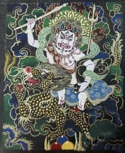 白财神又名白宝藏王,是观世音菩萨的慈悲化现。西藏密中的五路财神护法之一, 藏语称“赞布禄嘎尔布”、“藏拉噶波”,意为白财神。因为他以龙为坐骑,所以又称骑龙布禄金刚。其功德为祛病、除去一切贫苦,使众生富裕。