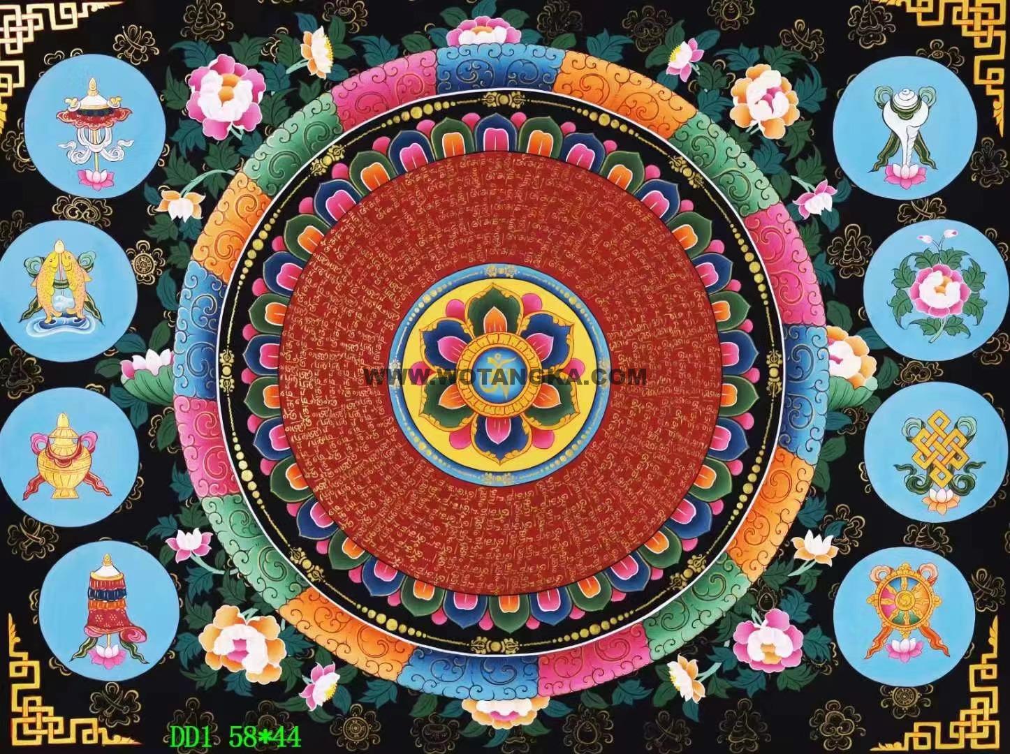 吉祥八宝又称藏八宝、八吉祥徽、八瑞或吉祥八宝图,是藏区最常见的装饰图案。在民房、寺院、帐篷、法器、服饰、餐具、哈达、唐卡、壁画、图书等上面到处都能见到。吉祥八宝图由吉祥结、莲花、白海螺、金轮、金幢、宝瓶、金鱼、宝伞等组成。莲花,为荷花,代表高洁,出世间而不为世俗所染,和善宏法。宝伞,代表消除贪、嗔、痴、慢、疑五毒。白海螺,为极为罕见的珍贵赠佛礼品。金轮,象征佛法永宏。胜利幢,代表佛法永胜,摧破一切邪道。 宝瓶,代表遴选灵童,聚满甘露,包罗善业智慧,满众生愿望。金鱼,代表撇开无明,聚满智慧。吉祥结是用绳打成,有数种结法,代表祥和、团结、和睦和佛智圆满。六字大明咒是观世音菩萨心咒,坛城象征宇宙本源,是圣坛的代表,挂与家里玄关之处,有镇宅辟邪的妖邪不入的作用,古代著名寺院皇宫都用此法门来镇宅辟邪,十分殊胜。