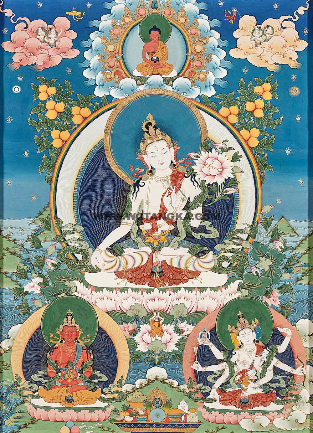 编号188-448265:彩绘唐卡-白度母·长寿三尊(100*70CM左右) | 沃唐卡www.WoTangKa.com