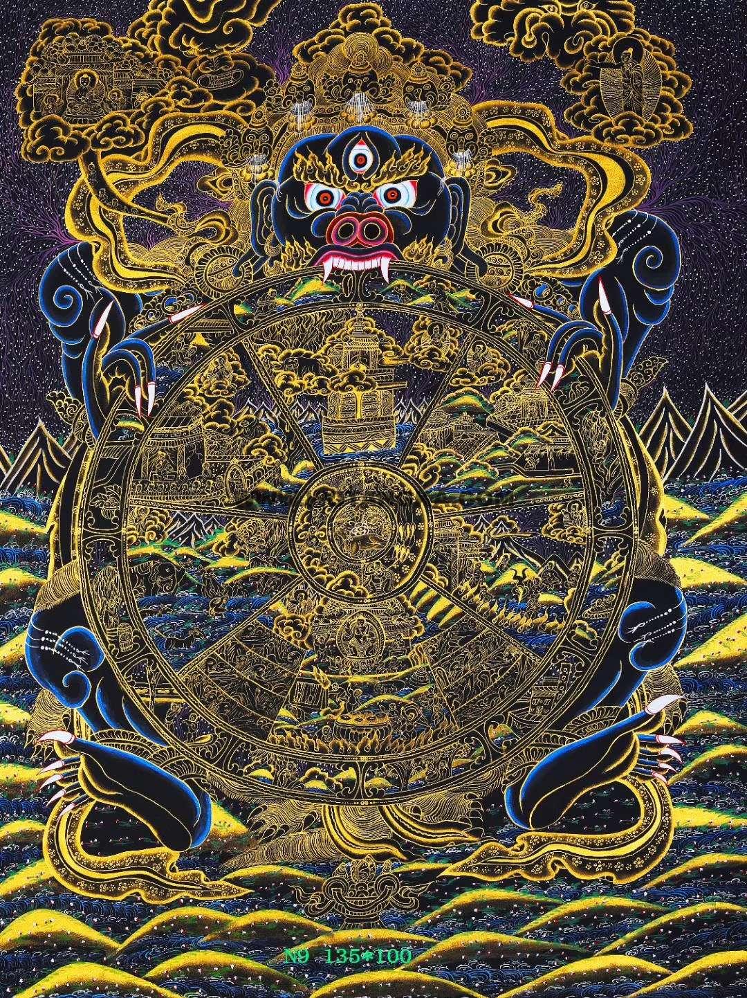 六道轮回图此类唐卡题材较为少见,整个画面是一个巨大的轮,被一位赤色的阎罗法王拥抱着。阎罗法王以獠牙锯齿衔着轮的上部,三目圆睁,五骷髅冠,下部露着明王的双脚和虎皮裙,表示芸芸众生都被佛法统捏着。
