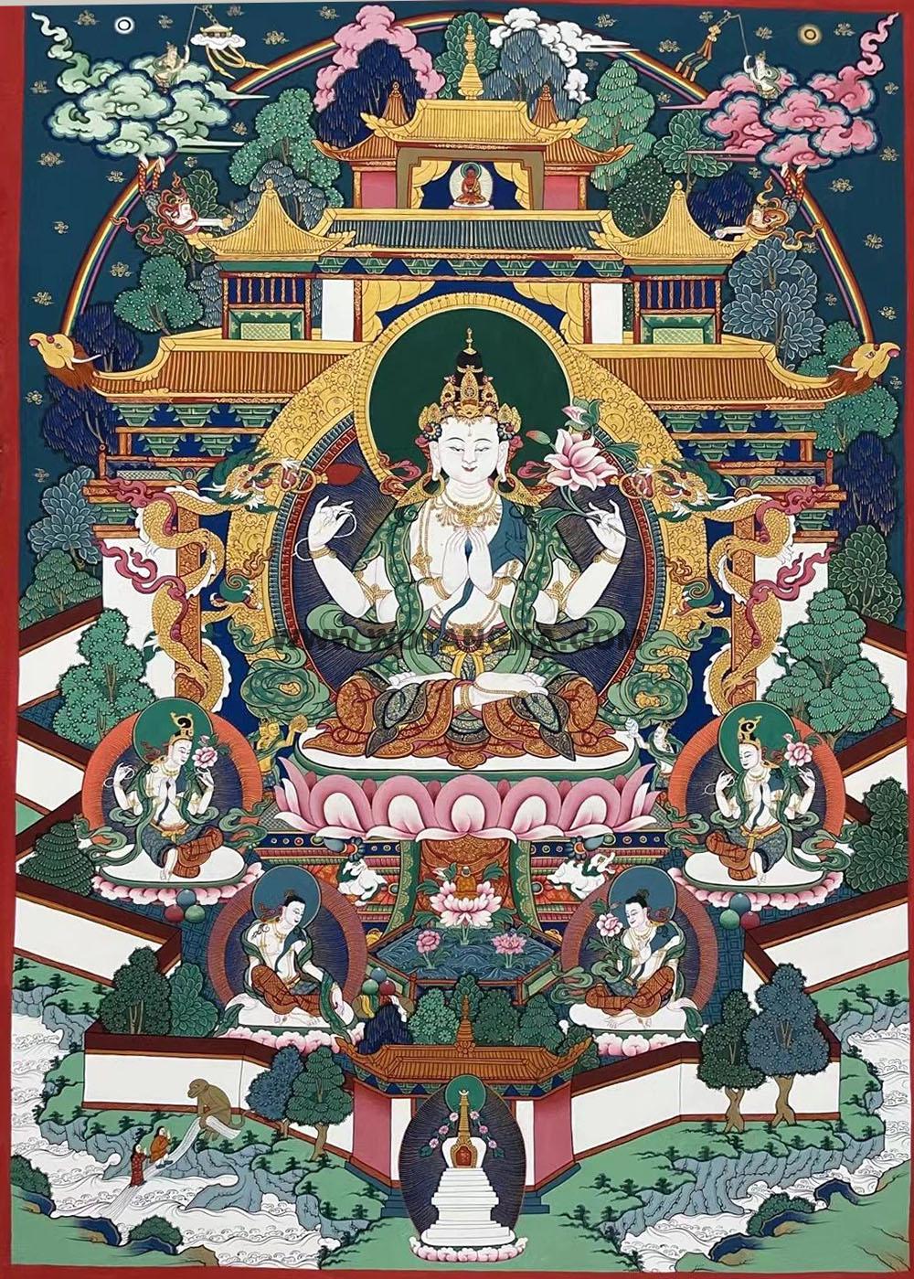 编号188-940855:彩绘唐卡-四臂观音·普陀道场(80*60CM左右) | 沃唐卡www.WoTangKa.com