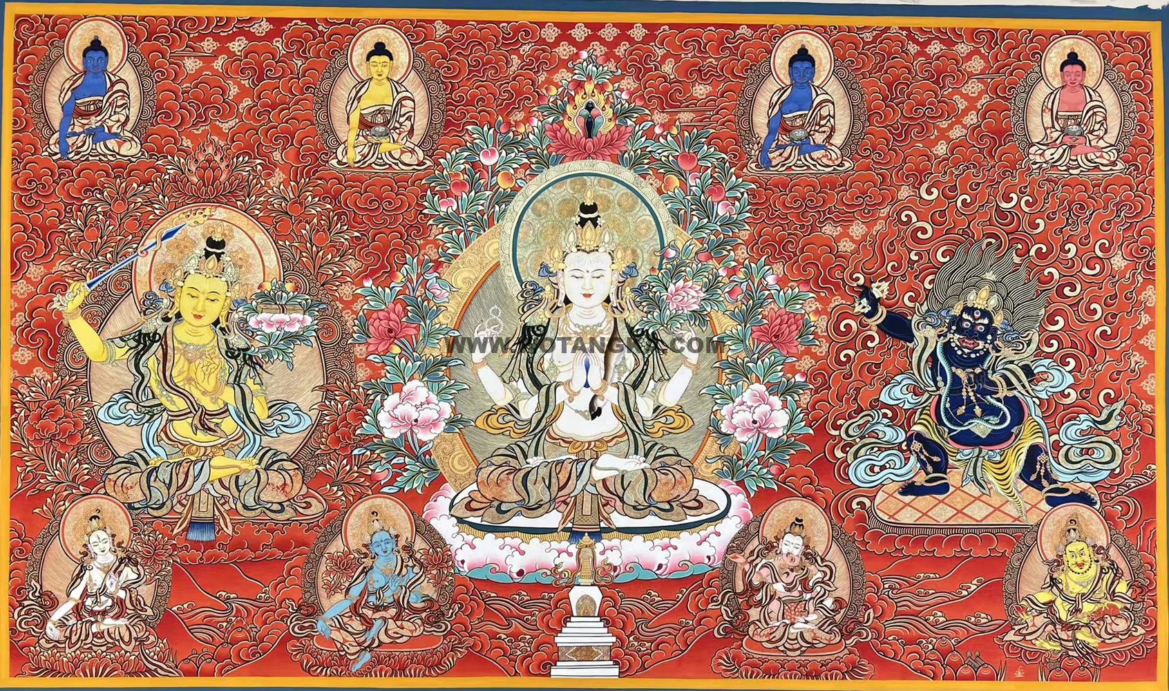 编号188-855192:红金唐卡-四臂观音·三怙主(70*130CM左右) | 沃唐卡www.WoTangKa.com