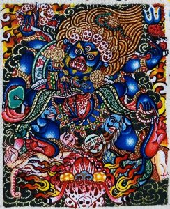 玛哈嘎拉是梵语,译为大黑天,即”怙主”之意,为上师、本尊、护法三根本之护法神,是佛教三根本的化身。其为调伏刚强众生而呈现忿怒相,本尊及眷属护法众除护持佛法外,依缘起多示现为两臂、四臂、六臂黑、白等形象,为藏传佛教诸宗共同推崇的智慧护法,是藏传佛教中最重要的护法神之一。