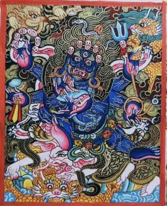 玛哈嘎拉是梵语,译为大黑天,即”怙主”之意,为上师、本尊、护法三根本之护法神,是佛教三根本的化身。其为调伏刚强众生而呈现忿怒相,本尊及眷属护法众除护持佛法外,依缘起多示现为两臂、四臂、六臂黑、白等形象,为藏传佛教诸宗共同推崇的智慧护法,是藏传佛教中最重要的护法神之一。