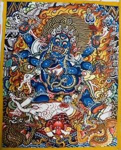 玛哈嘎拉是梵语,译为大黑天,即”怙主”之意,为上师、本尊、护法三根本之护法神,是佛教三根本的化身。其为调伏刚强众生而呈现忿怒相,本尊及眷属护法众除护持佛法外,依缘起多示现为两臂、四臂、六臂黑、白等形象,为藏传佛教诸宗共同推崇的智慧护法,是藏传佛教中最重要的护法神之一。