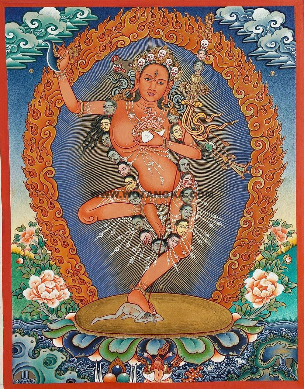 金刚亥母,梵文Vajravārāhī ,藏文名为多吉帕姆。她是一位女性神祇,其神格较为复杂。在藏传佛教噶举派中,她为女性本尊之首,玛尔巴、米拉日巴、冈波巴等诸位大成就者均依止她为本尊。左手托着盛满鲜血的嘎巴拉碗,象征她获得了极乐的体验,修证事业成功。左臂夹持喀章嘎,其上部有骷髅、干枯人首和新鲜人首,象征她压服了贪、嗔、痴的侵扰。右手上举,持钺刀,象征清除人的一切愚昧,勾召智慧真性。左腿单腿舞蹈立姿,踩踏人尸,表示战胜外在的敌人。