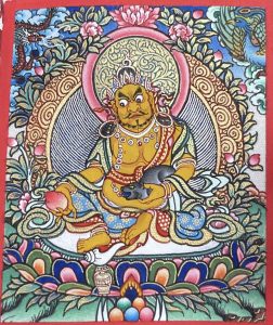 为令密乘行者有资财宏法利生,不被生活所逼,可安心向道,特赐予行者财利丰足。黄财神一面二臂,五佛冠为头饰,矮小肚大,双臂劲力,右手持布拉噶如意宝,左手提着吐宝鼠,身着天衣,蓝莲花及珠宝璎珞作装饰,胸前挂念珠。左足屈,右足踩着海螺宝,以如意姿安座于莲花月轮之上。 黄财神是藏传佛教各大教派普遍供养的五姓财神之一,因其身相黄色,故称黄财神。修持黄财神法、持诵其密咒,可获得黄财神庇佑,能增长福德、寿命、智能、物质及精上之受用,不被生活所逼,以及一切经济压迫,可安心向道。但修法者需发无上菩提心,广结善缘,勤行布施。万勿悭贪成性,护法降罪也. 黄财神即黄布禄金刚,黄财神面慈目善,头戴宝冠,坦胸露腹,戴着珍宝璎珞、珍宝耳环、珍宝手镯和珍宝足钏,上身穿丝制天衣,下身着丝制裙子,右手于右膝上捧喷焰末尼,左手握着吐宝鼬,以威镇坐姿坐在莲花宝座中央。身后有光环、祥云、远山。能增长福德、寿命、智慧、物质及精神上之受用。主司财富,能使一切众生脱于贫困,财源广进。