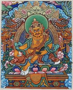 为令密乘行者有资财宏法利生,不被生活所逼,可安心向道,特赐予行者财利丰足。黄财神一面二臂,五佛冠为头饰,矮小肚大,双臂劲力,右手持布拉噶如意宝,左手提着吐宝鼠,身着天衣,蓝莲花及珠宝璎珞作装饰,胸前挂念珠。左足屈,右足踩着海螺宝,以如意姿安座于莲花月轮之上。 黄财神是藏传佛教各大教派普遍供养的五姓财神之一,因其身相黄色,故称黄财神。修持黄财神法、持诵其密咒,可获得黄财神庇佑,能增长福德、寿命、智能、物质及精上之受用,不被生活所逼,以及一切经济压迫,可安心向道。但修法者需发无上菩提心,广结善缘,勤行布施。万勿悭贪成性,护法降罪也. 黄财神即黄布禄金刚,黄财神面慈目善,头戴宝冠,坦胸露腹,戴着珍宝璎珞、珍宝耳环、珍宝手镯和珍宝足钏,上身穿丝制天衣,下身着丝制裙子,右手于右膝上捧喷焰末尼,左手握着吐宝鼬,以威镇坐姿坐在莲花宝座中央。身后有光环、祥云、远山。能增长福德、寿命、智慧、物质及精神上之受用。主司财富,能使一切众生脱于贫困,财源广进。