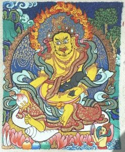 为令密乘行者有资财宏法利生,不被生活所逼,可安心向道,特赐予行者财利丰足。黄财神一面二臂,五佛冠为头饰,矮小肚大,双臂劲力,右手持布拉噶如意宝,左手提着吐宝鼠,身着天衣,蓝莲花及珠宝璎珞作装饰,胸前挂念珠。左足屈,右足踩着海螺宝,以如意姿安座于莲花月轮之上。 黄财神是藏传佛教各大教派普遍供养的五姓财神之一,因其身相黄色,故称黄财神。修持黄财神法、持诵其密咒,可获得黄财神庇佑,能增长福德、寿命、智能、物质及精上之受用,不被生活所逼,以及一切经济压迫,可安心向道。但修法者需发无上菩提心,广结善缘,勤行布施。万勿悭贪成性,护法降罪也. 黄财神即黄布禄金刚,黄财神面慈目善,头戴宝冠,坦胸露腹,戴着珍宝璎珞、珍宝耳环、珍宝手镯和珍宝足钏,上身穿丝制天衣,下身着丝制裙子,右手于右膝上捧喷焰末尼,左手握着吐宝鼬,以威镇坐姿坐在莲花宝座中央。身后有光环、祥云、远山。能增长福德、寿命、智慧、物质及精神上之受用。主司财富,能使一切众生脱于贫困,财源广进。