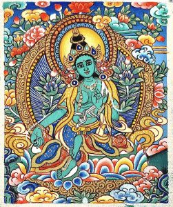 绿度母坐菩萨座于莲花月轮上,双脚屈左展右,左腿单坐,右腿向下舒展,踏在莲花上表示随时准备起身救度苦难众生,如慈爱的母亲一般,拯救钟爱的孩子;