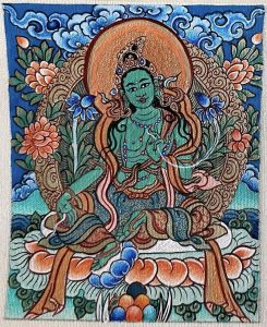 绿度母坐菩萨座于莲花月轮上,双脚屈左展右,左腿单坐,右腿向下舒展,踏在莲花上表示随时准备起身救度苦难众生,如慈爱的母亲一般,拯救钟爱的孩子;