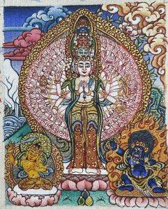 观音曾发誓要普度众生,然而众生芸芸,观音颇有力不胜任之感。于是观音分身成四十二个大慈大悲菩萨,意在利益安乐一切众生。观音的师傅无量佛见状,劝其不要急躁,否则欲速则不达。无量佛将四十二个个体撮合在一起,只留下四十二只手臂,又让每只手掌上长出一只眼睛,代表一个化身。这样除去主体的两只手臂,还有四十只手臂,每只手臂各配上佛门三界中的“二十五有”(佛教认为,三界中有二十五种有情存在环境,包括四洲、四意趣、六欲天等),两数相乘为一千。