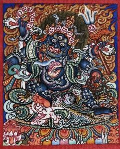 玛哈嘎拉是梵语,译为大黑天,即”怙主”之意,为上师、本尊、护法三根本之护法神,是佛教三根本的化身。其为调伏刚强众生而呈现忿怒相,本尊及眷属护法众除护持佛法外,依缘起多示现为两臂、四臂、六臂黑、白等形象,为藏传佛教诸宗共同推崇的智慧护法,是藏传佛教中最重要的护法神之一。