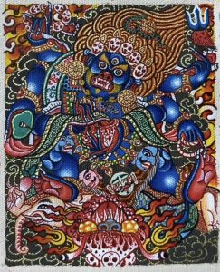 玛哈嘎拉是梵语,译为大黑天,即”怙主”之意,为上师、本尊、护法三根本之护法神,是佛教三根本的化身。其为调伏刚强众生而呈现忿怒相,本尊及眷属护法众除护持佛法外,依缘起多示现为两臂、四臂、六臂黑、白等形象,为藏传佛教诸宗共同推崇的智慧护法,是藏传佛教中最重要的护法神之一。