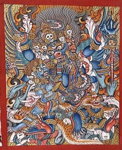 大藏经密续云:普巴金刚是一切诸佛菩萨事业化现的总体,普巴金刚具有三面、六臂、四足、双翅,具有无比大威力,不仅可降魔,亦可息灾。
