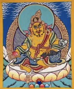 为令密乘行者有资财宏法利生,不被生活所逼,可安心向道,特赐予行者财利丰足。黄财神一面二臂,五佛冠为头饰,矮小肚大,双臂劲力,右手持布拉噶如意宝,左手提着吐宝鼠,身着天衣,蓝莲花及珠宝璎珞作装饰,胸前挂念珠。左足屈,右足踩着海螺宝,以如意姿安座于莲花月轮之上。 黄财神是藏传佛教各大教派普遍供养的五姓财神之一,因其身相黄色,故称黄财神。修持黄财神法、持诵其密咒,可获得黄财神庇佑,能增长福德、寿命、智能、物质及精上之受用,不被生活所逼,以及一切经济压迫,可安心向道。但修法者需发无上菩提心,广结善缘,勤行布施。万勿悭贪成性,护法降罪也. 黄财神即黄布禄金刚,黄财神面慈目善,头戴宝冠,坦胸露腹,戴着珍宝璎珞、珍宝耳环、珍宝手镯和珍宝足钏,上身穿丝制天衣,下身着丝制裙子,右手于右膝上捧喷焰末尼,左手握着吐宝鼬,以威镇坐姿坐在莲花宝座中央。身后有光环、祥云、远山。能增长福德、寿命、智慧、物质及精神上之受用。主司财富,能使一切众生脱于贫困,财源广进。