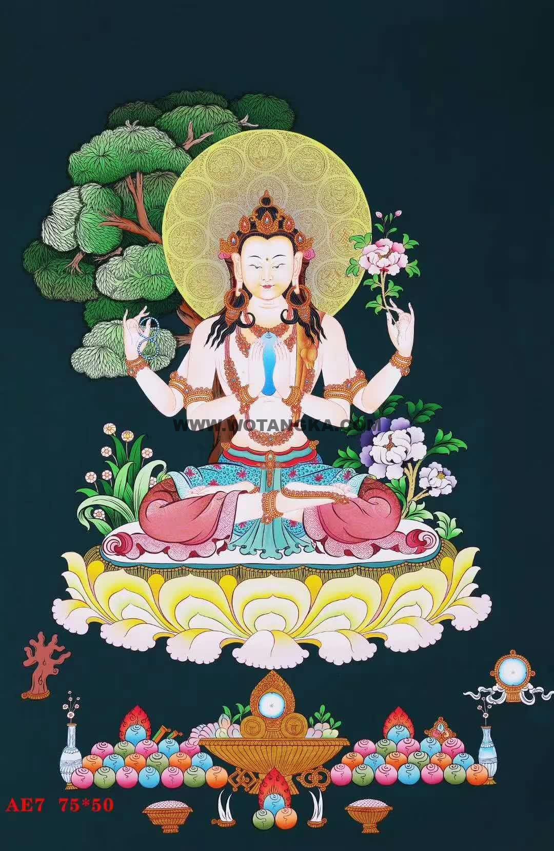 尼泊尔精品布本唐卡《四臂观音》唐卡手绘布本,天然矿石颜料着色晕染,画工细腻,开脸殊胜,是一副难得一见的好唐卡作品。