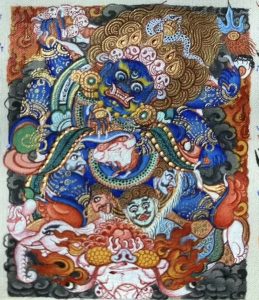 玛哈嘎拉是梵语,译为大黑天,即”怙主”之意,为上师、本尊、护法三根本之护法神,是佛教三根本的化身。其为调伏刚强众生而呈现忿怒相,本尊及眷属护法众除护持佛法外,依缘起多示现为两臂、四臂、六臂黑、白等形象,为藏传佛教诸宗共同推崇的智慧护法,是藏传佛教中最重要的护法神之一。
