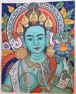 绿度母坐菩萨座于莲花月轮上,双脚屈左展右,左腿单坐,右腿向下舒展,踏在莲花上表示随时准备起身救度苦难众生,如慈爱的母亲一般,拯救钟爱的孩子;