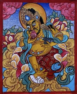 为令密乘行者有资财宏法利生,不被生活所逼,可安心向道,特赐予行者财利丰足。黄财神一面二臂,五佛冠为头饰,矮小肚大,双臂劲力,右手持布拉噶如意宝,左手提着吐宝鼠,身着天衣,蓝莲花及珠宝璎珞作装饰,胸前挂念珠。左足屈,右足踩着海螺宝,以如意姿安座于莲花月轮之上。 黄财神是藏传佛教各大教派普遍供养的五姓财神之一,因其身相黄色,故称黄财神。修持黄财神法、持诵其密咒,可获得黄财神庇佑,能增长福德、寿命、智能、物质及精上之受用,不被生活所逼,以及一切经济压迫,可安心向道。但修法者需发无上菩提心,广结善缘,勤行布施。万勿悭贪成性,护法降罪也. 黄财神即黄布禄金刚,黄财神面慈目善,头戴宝冠,坦胸露腹,戴着珍宝璎珞、珍宝耳环、珍宝手镯和珍宝足钏,上身穿丝制天衣,下身着丝制裙子,右手于右膝上捧喷焰末尼,左手握着吐宝鼬,以威镇坐姿坐在莲花宝座中央。身后有光环、祥云、远山。能增长福德、寿命、智慧、物质及精神上之受用。主司财富,能使一切众生脱于贫困,财源广进。