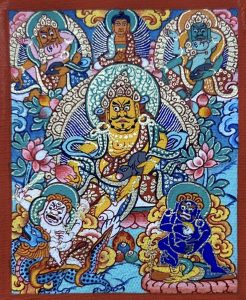 黄财神,藏名藏拉色波,是密教之护法神祇,诸财神之首。黄财神是藏传佛教各大教派普遍供养的五姓财神之一,因其身肤黄色,故称为黄财神。相传黄财神过去是位菩萨,早已修证五道十地。昔日释迦牟尼佛在中印度摩陀国之灵鹫山讲说大般若经义时,诸方魔鬼神怪前来阻碍,令山崩倒塌,此时黄财神奋勇现身庇护,使得众多闻法比丘安然无恙。后来释迦牟尼如来嘱黄财神皈依佛法,助益一切贫苦众生,走佛教之路,遂成为大护法神。 修持黄财神法、持诵其密咒,可获得黄财神庇佑,能增长福德、寿命、智能、物质及精神上之受用,财源茂盛,免除贫穷。为令密乘行者有资财宏法利生,不被生活所逼,可安心向道,特赐予行者财利丰足。修持黄财神法者,需发无上菩提心,勤行布施,广结善缘,万勿贪悭,心诚如一,发愿救度一切众生于贫困,则福德更不可限量,以此发心来修财神法,才能够得到圆满富足。