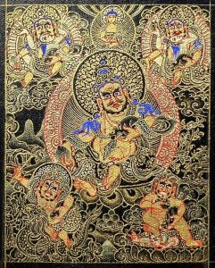 黑财神,藏名(臧哈纳玻),乃是五方佛里面的东方金刚不动佛,为了利益娑婆众生能脱离穷困之苦恼而化现,主要为驱除所有恶运纠缠,并使一切善愿都能心想事成圆满无碍。据莲华生大士所说,金刚手菩萨在北方夜叉净土世界,将此黑财神法门传给空行母,并要求空行母再传给恒常心存善念的幸运者。其后这些修持法门由二位成就的上师,取自殊胜的宝石内。此法门,以穷人,下阶级,独居之行者易于相应,若心中长存善念,黑财神加持将是永远弗失。