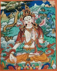 修持白度母法,能消除病因灾劫,能增长寿命及福慧,斩断轮回之根,免除魔障瘟疫,凡有所求无不如愿。