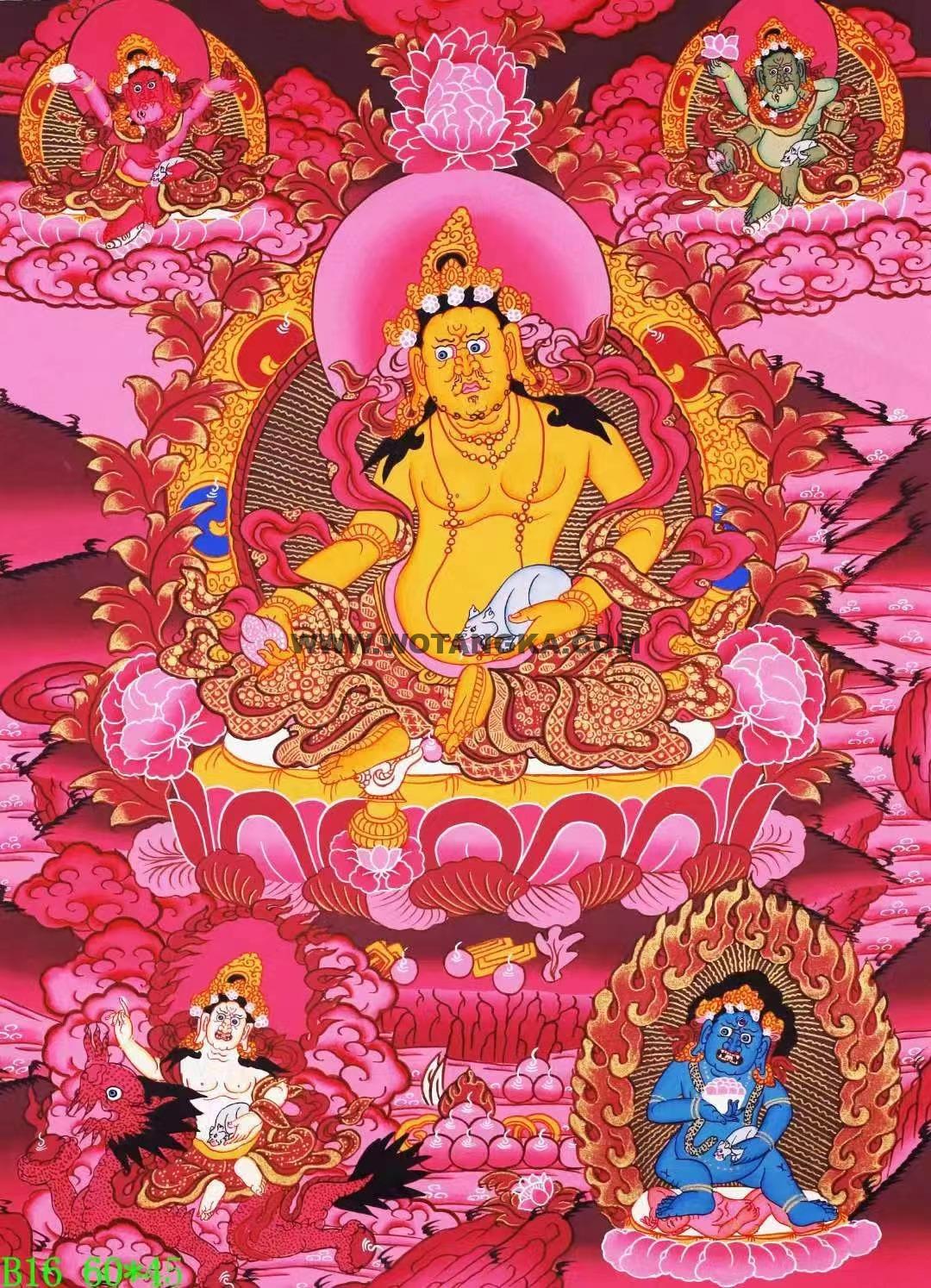 黄财神为北方司财众部之首领,掌无尽宝库,修此法者,可消灭六道穷苦,增长福德、寿命、智慧, 以及一切物质与精神上的受用。心灵上得到满足。黄财神是藏传佛教各大教派普遍供养的五姓财神之一,因其身相黄色,故称黄财神。修持黄财神法、持诵其密咒,可获得黄财神庇佑,能增长福德、寿命、智能、物质及精上之受用,不被生活所逼,以及一切经济压迫,可安心向道。但修法者需发无上菩提心,广结善缘,勤行布施。万勿悭贪成性,护法降罪也. 黄财神面慈目善,头戴宝冠,坦胸露腹,戴着珍宝璎珞、珍宝耳环、珍宝手镯和珍宝足钏,上身穿丝制天衣,下身着丝制裙子,右手于右膝上捧喷焰末尼,左手握着吐宝鼬,以威镇坐姿坐在莲花宝座中央。身后有光环、祥云、远山。能增长福德、寿命、智慧、物质及精神上之受用。主司财富,能使一切众生脱于贫困,财源广进。