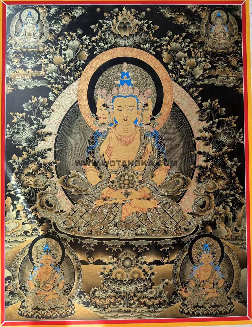 中国唐卡艺术作品中的【四面大日如来·五方佛】唐卡手绘布本,热贡知名画师拉旦本·画院出品,收藏供奉不要错过。作品主尊宝相传神, 采用天然矿石晕染,纯金描线,画工细腻,殊胜,精美、风格富丽,采用24K真金描绘,画工细腻,开脸殊胜,是一副难得一见的好唐卡作品。