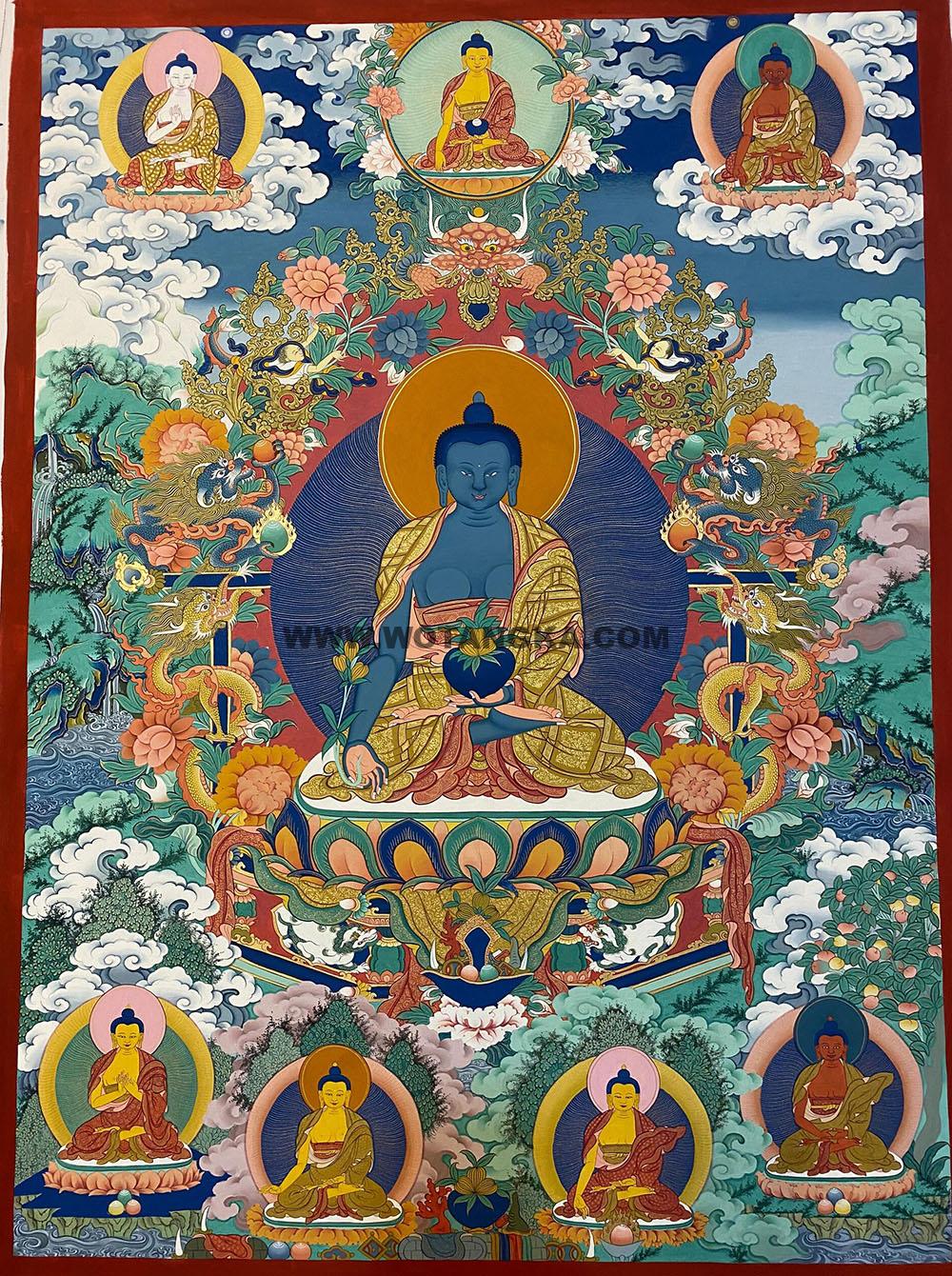 药师佛全称药师琉璃光如来,也有人称大医王佛、医王善逝或消灾延寿药师佛,为东方琉璃净土的教主。为药师本用以比喻能治众生贪、瞋、痴的医师。在中国佛教一般用以祈求消灾延寿。七佛药师即七尊药师。又作七躬医王。藏历初八,药师佛节日。药师七佛住于东方去此四恒河沙乃至十恒河沙世界,曾发大弘誓愿要救拔五浊恶世众生苦恼。佛陀的悲愿无量无边,七佛之弘深本愿不可言尽。