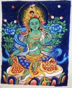 绿度母坐菩萨座于莲花月轮上,双脚屈左展右,左腿单坐,右腿向下舒展,踏在莲花上表示随时准备起身救度苦难众生,如慈爱的母亲一般,拯救钟爱的孩子;