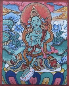 绿度母坐菩萨座于莲花月轮上,双脚屈左展右,左腿单坐,右腿向下舒展,踏在莲花上表示随时准备起身救度苦难众生,如慈爱的母亲一般,拯救钟爱的孩子;