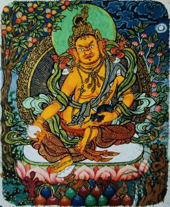 为令密乘行者有资财宏法利生,不被生活所逼,可安心向道,特赐予行者财利丰足。黄财神一面二臂,五佛冠为头饰,矮小肚大,双臂劲力,右手持布拉噶如意宝,左手提着吐宝鼠,身着天衣,蓝莲花及珠宝璎珞作装饰,胸前挂念珠。左足屈,右足踩着海螺宝,以如意姿安座于莲花月轮之上。 黄财神是藏传佛教各大教派普遍供养的五姓财神之一,因其身相黄色,故称黄财神。修持黄财神法、持诵其密咒,可获得黄财神庇佑,能增长福德、寿命、智能、物质及精上之受用,不被生活所逼,以及一切经济压迫,可安心向道。但修法者需发无上菩提心,广结善缘,勤行布施。万勿悭贪成性,护法降罪也. 黄财神即黄布禄金刚,黄财神面慈目善,头戴宝冠,坦胸露腹,戴着珍宝璎珞、珍宝耳环、珍宝手镯和珍宝足钏,上身穿丝制天衣,下身着丝制裙子,右手于右膝上捧喷焰末尼,左手握着吐宝鼬,以威镇坐姿坐在莲花宝座中央。身后有光环、祥云、远山。能增长福德、寿命、智慧、物质及精神上之受用。主司财富,能使一切众生脱于贫困,财源广进。