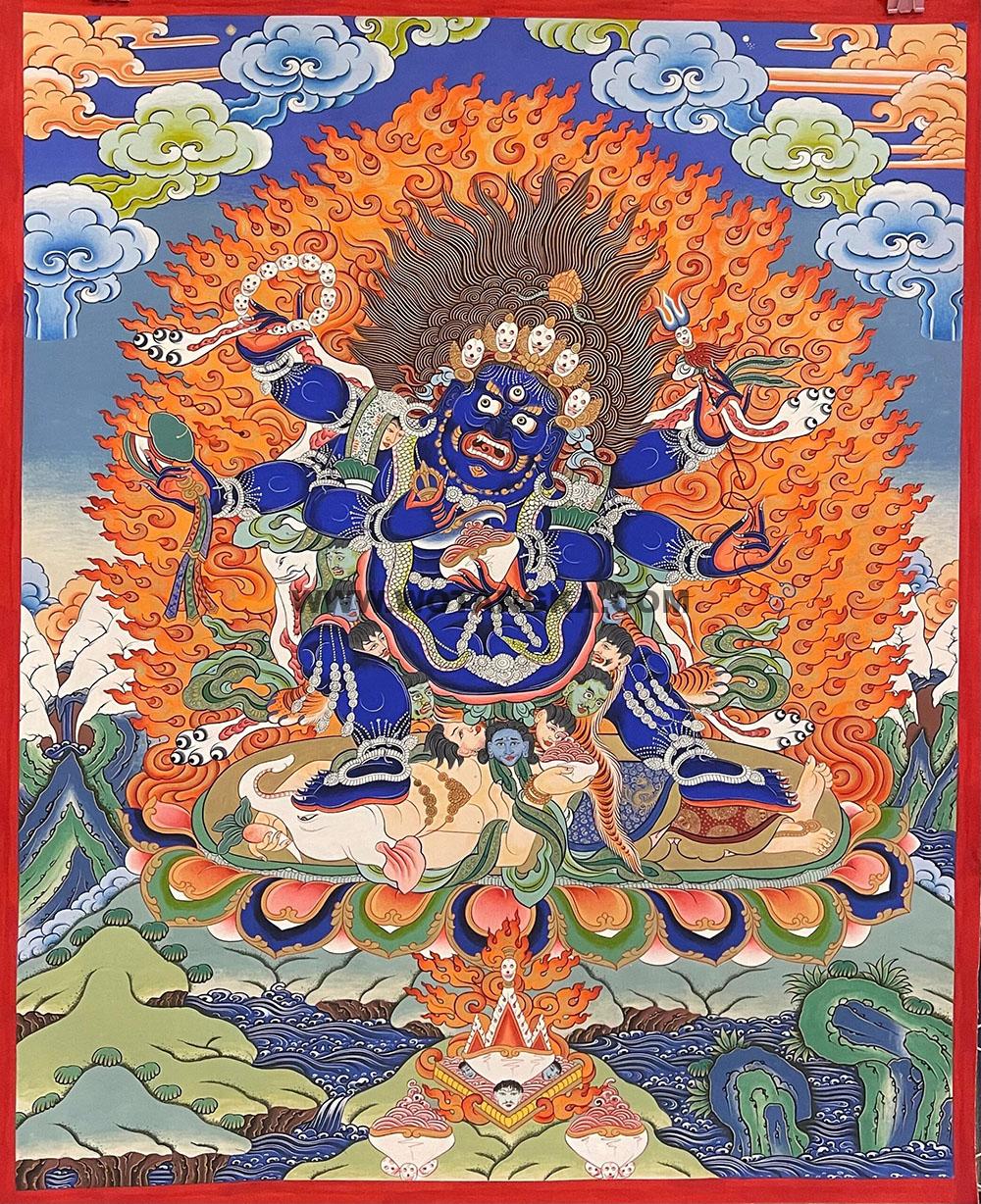 玛哈嘎拉是梵语,译为大黑天,即”怙主”之意,为上师、本尊、护法三根本之护法神,是佛教三根本的化身。其为调伏刚强众生而呈现忿怒相,本尊及眷属护法众除护持佛法外,依缘起多示现为两臂、四臂、六臂黑、白等形象,为藏传佛教诸宗共同推崇的智慧护法,是藏传佛教中最重要的护法神之一。