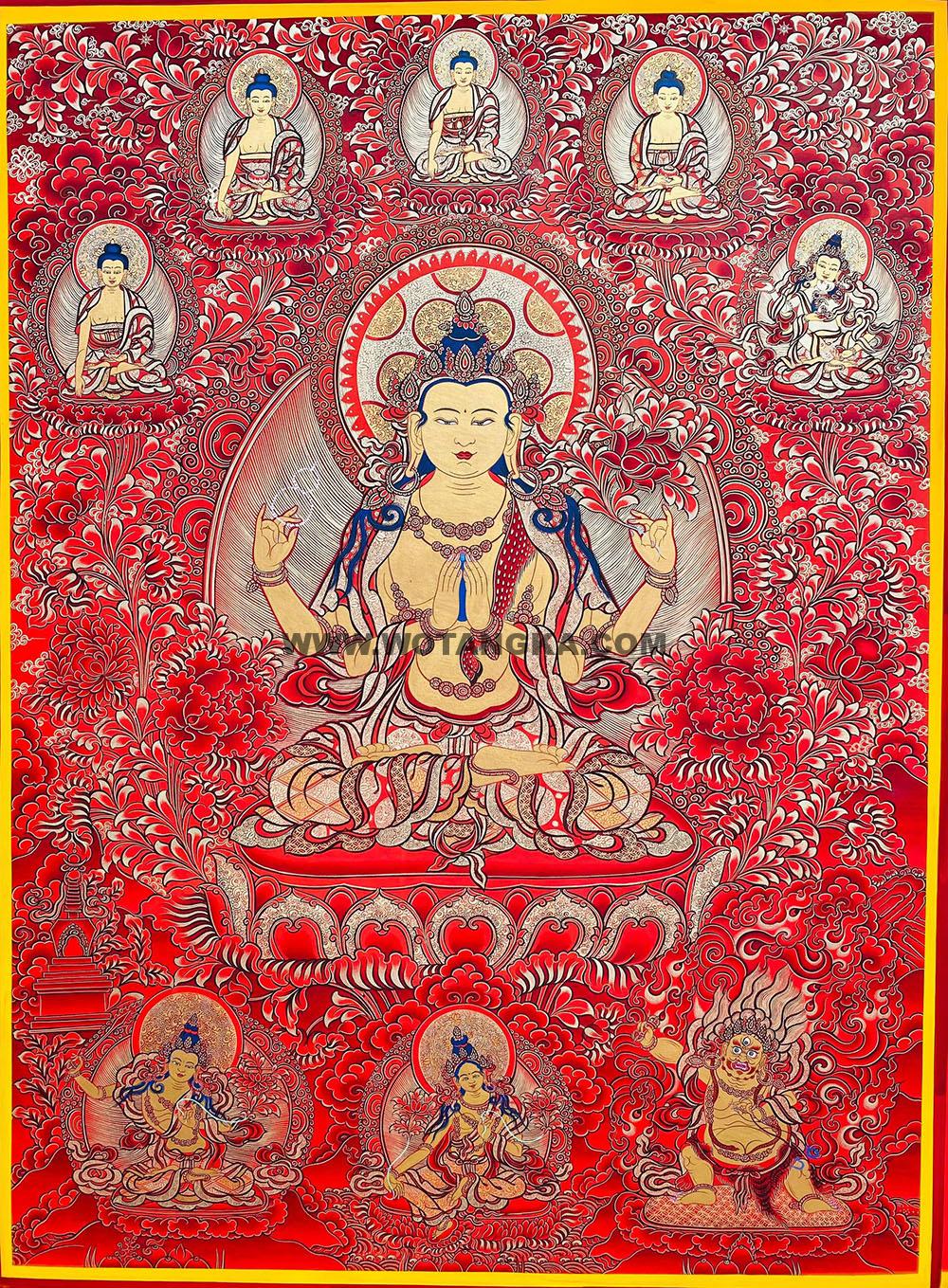 编号188-923705:红金唐卡-四臂观音·三怙主(100*70CM左右) | 沃唐卡www.WoTangKa.com