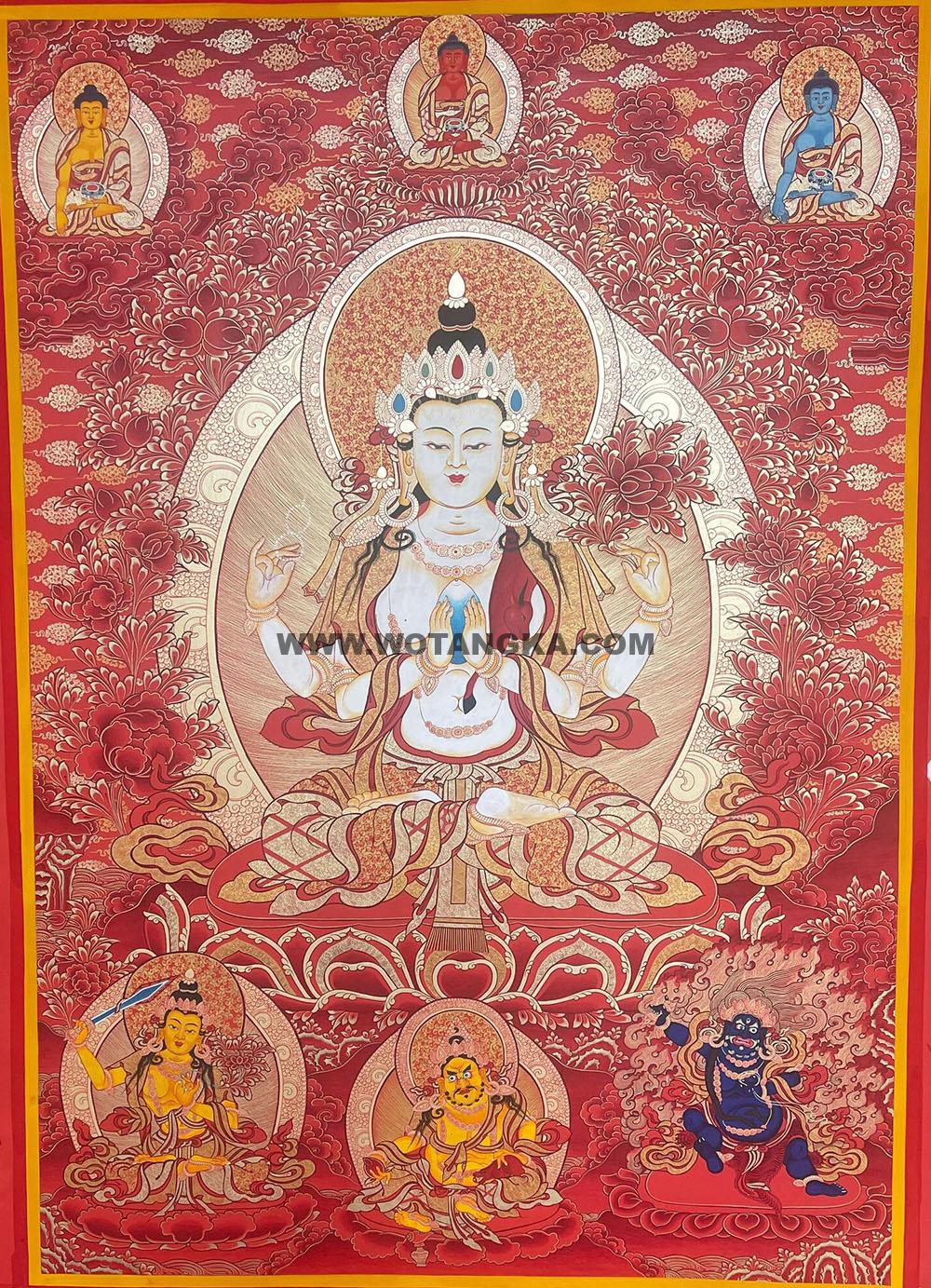 中国唐卡艺术作品中的【四臂观音·三怙主】唐卡手绘布本,热贡知名画师拉旦本·画院出品,收藏供奉不要错过。作品主尊宝相传神, 采用天然矿石晕染,纯金描线,画工细腻,殊胜,精美、风格富丽,采用24K真金描绘,画工细腻,开脸殊胜,是一副难得一见的好唐卡作品。