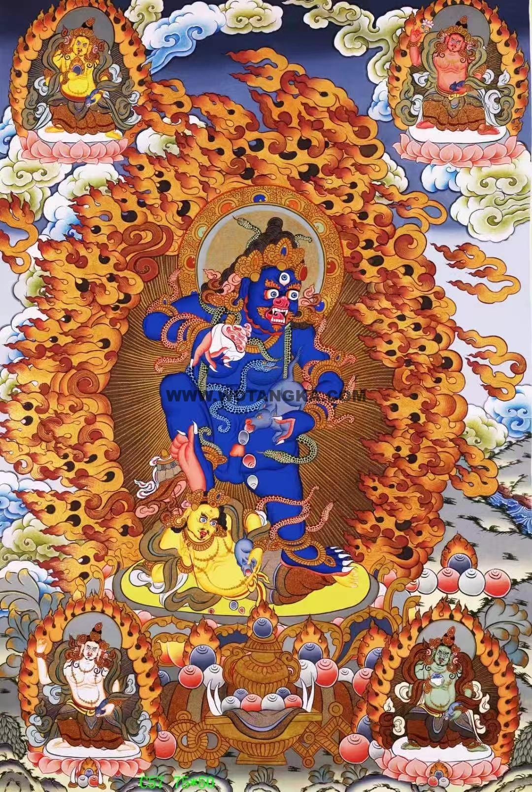 黑财神藏名“藏拉那波”,乃是东方佛里的金刚不动佛。为了利益娑婆众生解脱穷困之苦而化现,在密宗认为,黑财神是五姓财神中施财立即见效的财神,甚至称他为财神王。黑财神乃是五方佛之东方金刚不动佛,为利益娑婆众生摆脱穷困的苦恼所做的化现。 身青黑色,故名。主要功德为驱除所有违缘的纠缠,并使一切善愿都能心想事成,圆满无碍。 此尊身形矮胖,大肚福相,红发黑肤裸体,三目圆睁,发须眉赤红如火,头戴宝冠,以珠宝璎珞、以八龙王为饰,生殖器上竖,辉光靠背,粗体大腹,右手擎盈血颅器于胸,左手捉吐宝鼠,两足以右曲左伸姿威立, 踏于黄色持财天之背,安住莲花月轮座上。修持黑财神法门,可获其庇佑,消除怨敌、偷盗、病魔等障,使诸受用财富增长。