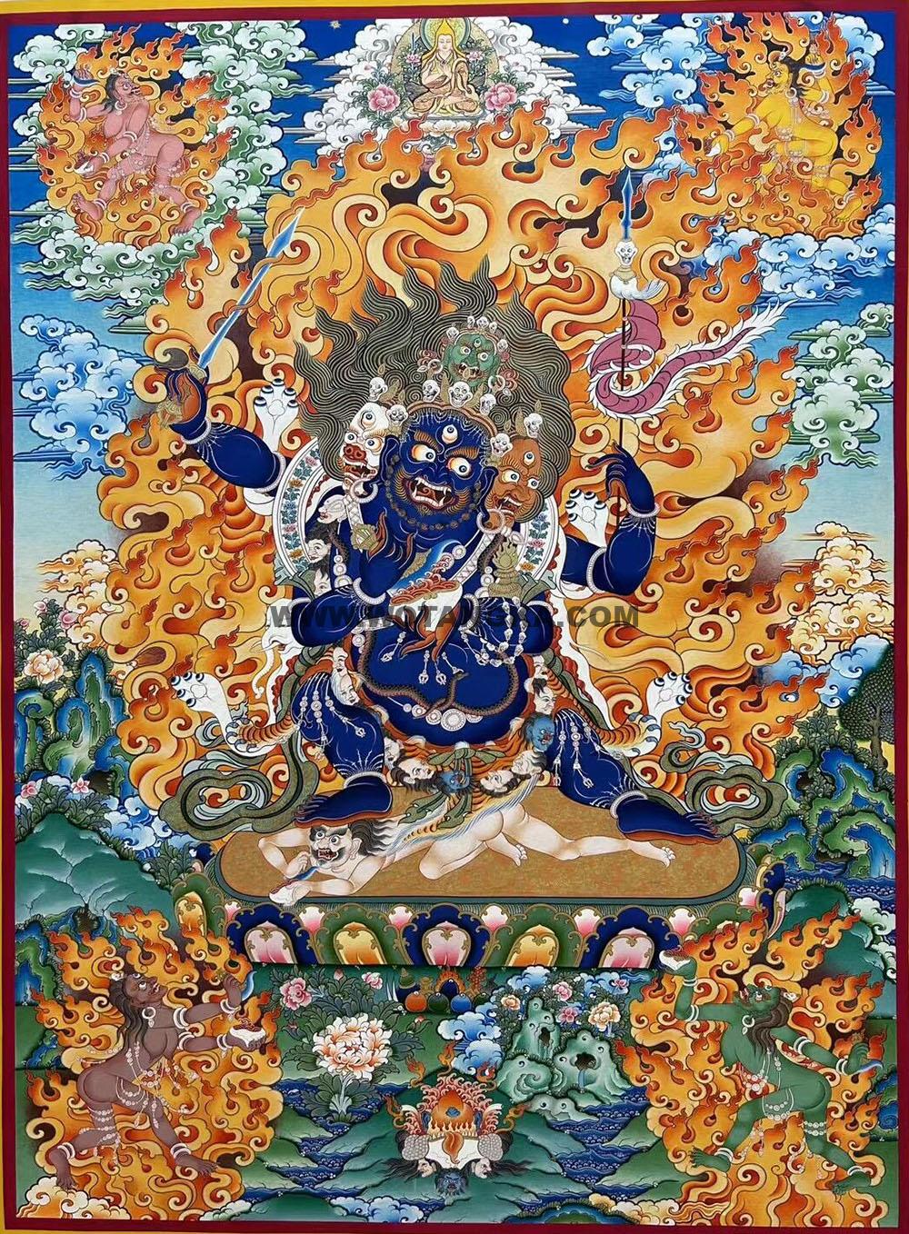 玛哈嘎拉是梵语,意思是“大黑”,即“怙主”之意。玛哈嘎拉是佛教三根本的化身。其为调伏刚强众生而呈现忿怒相,本尊及眷属护法众除护持佛法外,依缘起多示现为两臂、四臂、六臂黑,白等形象,为藏传佛教诸宗共同推崇的智慧护法。
