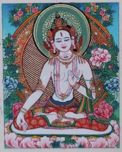 白度母为二十一度母之一,是一切众生尤其是女性的无比圣神,是保佑心想事成,赐寿除障的如意宝。白度母集二十一度母之功德于一身,能消除病痛邪风,妖魔鬼怪等外部之障与贪嗔痴等内部之障,勇猛无比,形随众生,变幻莫测。藏传佛教认为生信者只要一念及,即能以兄弟姐妹之情倾力相助,堪称众女神之王。