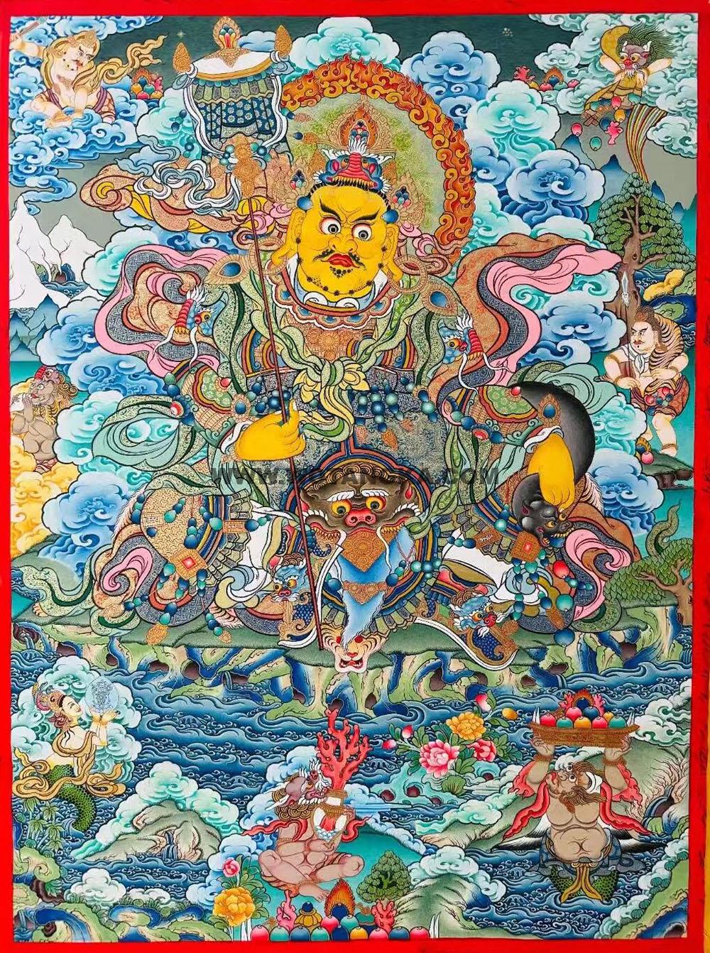 唐卡作品名称:多闻天王威镇法相龙族献宝吉祥财富供养图