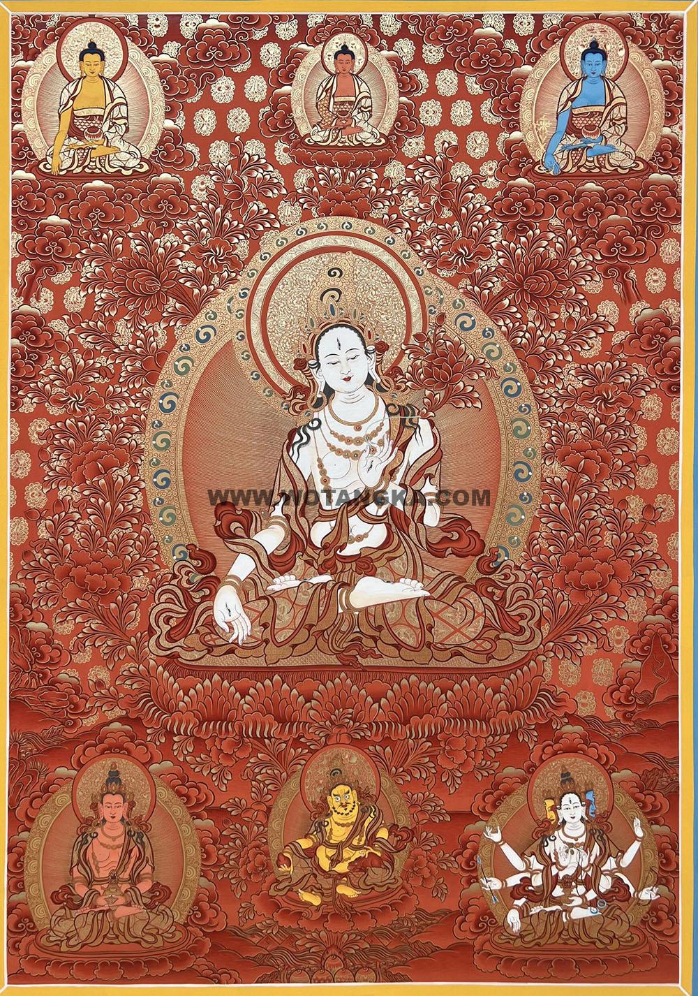 唐卡作品名称:白度母长寿尊天界三世佛吉祥财富如愿供养图