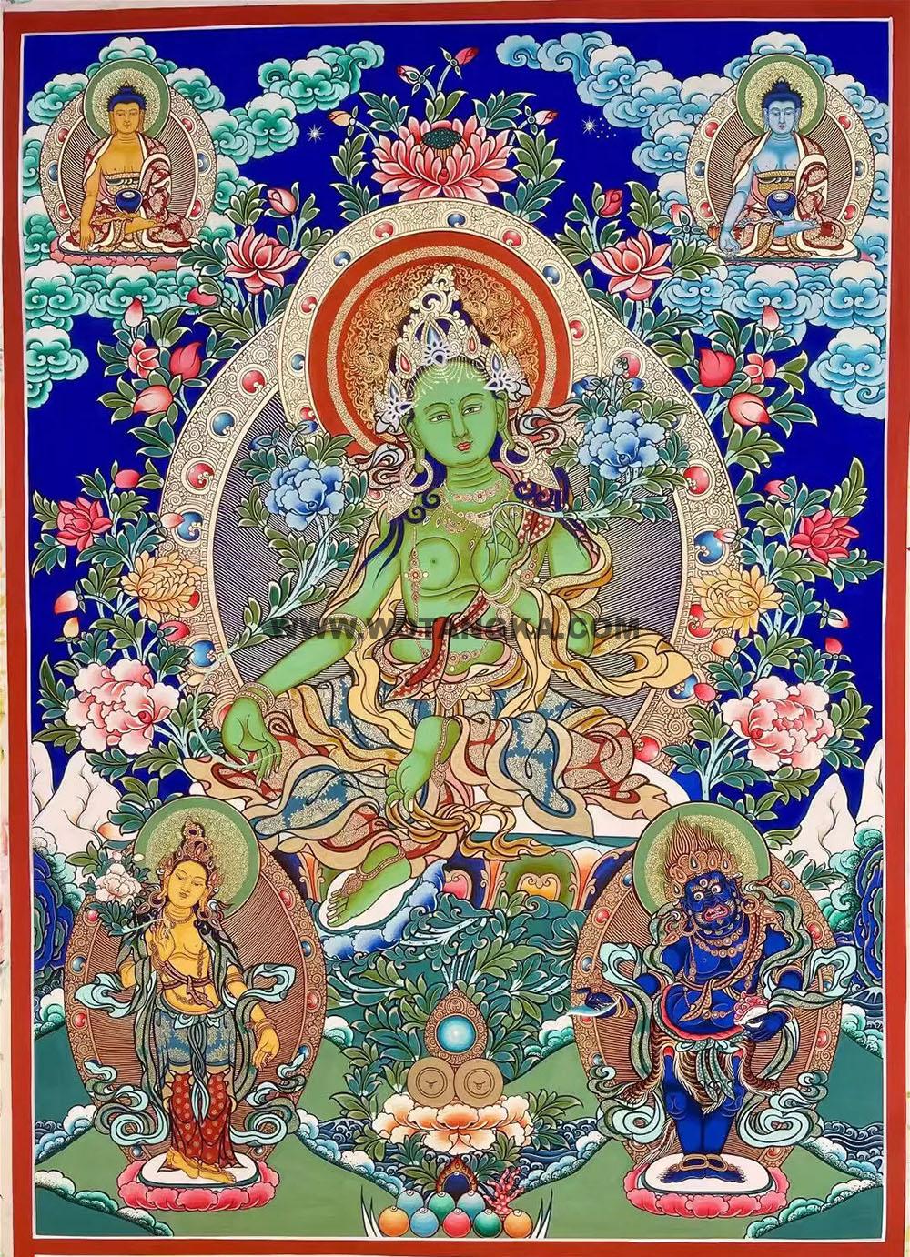 中国唐卡艺术作品中的【绿度母】唐卡手绘布本,热贡知名画师尖木措·画院出品,收藏供奉不要错过。作品主尊宝相传神, 采用天然矿石晕染,纯金描线,画工细腻,殊胜,精美、风格富丽,采用24K真金描绘,画工细腻,开脸殊胜,是一副难得一见的好唐卡作品。