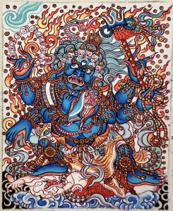 玛哈嘎拉是梵语,译为大黑天,即”怙主”之意,为上师、本尊、护法三根本之护法神,是佛教三根本的化身。其为调伏刚强众生而呈现忿怒相,本尊及眷属护法众除护持佛法外,依缘起多示现为两臂、四臂、六臂黑、白等形象,为藏传佛教诸宗共同推崇的智慧护法,是藏传佛教中最重要的护法神之一。