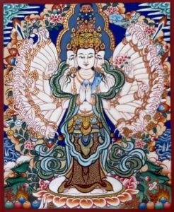 千手观音为观音部果德之尊。“千”为无量及圆满之义,以“千手”表示大慈悲的无量广大,以“千眼”代表智慧的圆满无碍。根据《陀罗尼经》云:千手千眼观世音能利益安乐一切众生,随众生之机,相应五部五种法,而满足一切愿求。