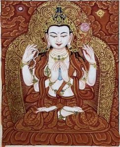 四臂观音本尊身颜洁白如月,头戴五佛冠,发黑色结髻,中央二手合掌於胸前,捧有摩尼宝珠,右手持水晶念珠。左手拈八瓣莲花与耳际齐,面貌寂静含笑。以菩萨慧眼凝视众生,凡被其观者尽得解脱。全身花蔓庄严,双跏趺坐於莲花月轮上,身发极大五彩光,明朗照耀。