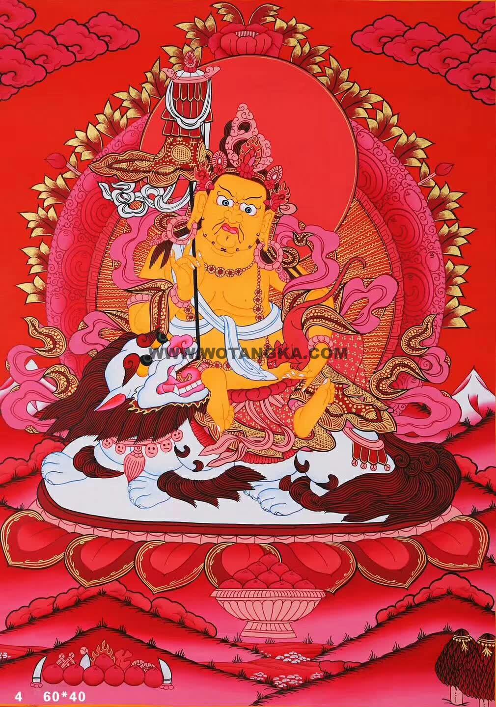 财宝天王职掌人世间功德与福报之转化,散发人间财富,护持佛法,消除魔障之挑战,净化天人成就大光明境地,修持此法将可立得福报。财宝天王属四大天王之一,闻于四方,居须弥山北,率月叉诸部。又依藏密中所述,财宝天王名,乃五方佛之南方宝生佛所化现,协助财宝天王救渡众生,以满众生之愿。天王身黄色,如同金子般灿烂辉煌,从他的身上,放射出万丈芒。头戴缀满珠宝的王冠,黄金的盔甲上套着华贵的丝绸天衣,圆睁两眼,满鬓胡须,骑一匹咆哮着的绿鬃白狮。他的左手抱着一只吐宝鼬,从鼬的嘴里能吐出取之不尽用之不竭的珍宝,由于其乐善好施,为人间布下无穷财富。整体造像度量严格,法相庄严,绘制细腻,颜色变化丰富,线条工整流畅,精品之作。