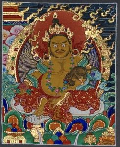 为令密乘行者有资财宏法利生,不被生活所逼,可安心向道,特赐予行者财利丰足。黄财神一面二臂,五佛冠为头饰,矮小肚大,双臂劲力,右手持布拉噶如意宝,左手提着吐宝鼠,身着天衣,蓝莲花及珠宝璎珞作装饰,胸前挂念珠。左足屈,右足踩着海螺宝,以如意姿安座于莲花月轮之上。 黄财神是藏传佛教各大教派普遍供养的五姓财神之一,因其身相黄色,故称黄财神。修持黄财神法、持诵其密咒,可获得黄财神庇佑,能增长福德、寿命、智能、物质及精上之受用,不被生活所逼,以及一切经济压迫,可安心向道。但修法者需发无上菩提心,广结善缘,勤行布施。万勿悭贪成性,护法降罪也. 黄财神即黄布禄金刚,黄财神面慈目善,头戴宝冠,坦胸露腹,戴着珍宝璎珞、珍宝耳环、珍宝手镯和珍宝足钏,上身穿丝制天衣,下身着丝制裙子,右手于右膝上捧喷焰末尼,左手握着吐宝鼬,以威镇坐姿坐在莲花宝座中央。身后有光环、祥云、远山。能增长福德、寿命、智慧、物质及精神上之受用。主司财富,能使一切众生脱于贫困,财源广进。