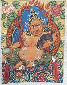 为令密乘行者有资财宏法利生,不被生活所逼,可安心向道,特赐予行者财利丰足。黄财神一面二臂,五佛冠为头饰,矮小肚大,双臂劲力,右手持布拉噶如意宝,左手提着吐宝鼠,身着天衣,蓝莲花及珠宝璎珞作装饰,胸前挂念珠。左足屈,右足踩着海螺宝,以如意姿安座于莲花月轮之上。 黄财神是藏传佛教各大教派普遍供养的五姓财神之一,因其身相黄色,故称黄财神。修持黄财神法、持诵其密咒,可获得黄财神庇佑,能增长福德、寿命、智能、物质及精上之受用,不被生活所逼,以及一切经济压迫,可安心向道。但修法者需发无上菩提心,广结善缘,勤行布施。万勿悭贪成性,护法降罪也. 黄财神即黄布禄金刚,黄财神面慈目善,头戴宝冠,坦胸露腹,戴着珍宝璎珞、珍宝耳环、珍宝手镯和珍宝足钏,上身穿丝制天衣,下身着丝制裙子,右手于右膝上捧喷焰末尼,左手握着吐宝鼬,以威镇坐姿坐在莲花宝座中央。身后有光环、祥云、远山。能增长福德、寿命、智慧、物质及精神上之受用。主司财富,能使一切众生脱于贫困,财源广进。