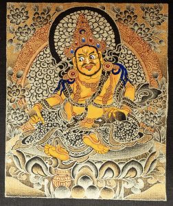 为令密乘行者有资财宏法利生,不被生活所逼,可安心向道,特赐予行者财利丰足。黄财神一面二臂,五佛冠为头饰,矮小肚大,双臂劲力,右手持布拉噶如意宝,左手提着吐宝鼠,身着天衣,蓝莲花及珠宝璎珞作装饰,胸前挂念珠。左足屈,右足踩着海螺宝,以如意姿安座于莲花月轮之上。 黄财神是藏传佛教各大教派普遍供养的五姓财神之一,因其身相黄色,故称黄财神。修持黄财神法、持诵其密咒,可获得黄财神庇佑,能增长福德、寿命、智能、物质及精上之受用,不被生活所逼,以及一切经济压迫,可安心向道。但修法者需发无上菩提心,广结善缘,勤行布施。万勿悭贪成性,护法降罪也. 黄财神即黄布禄金刚,黄财神面慈目善,头戴宝冠,坦胸露腹,戴着珍宝璎珞、珍宝耳环、珍宝手镯和珍宝足钏,上身穿丝制天衣,下身着丝制裙子,右手于右膝上捧喷焰末尼,左手握着吐宝鼬,以威镇坐姿坐在莲花宝座中央。身后有光环、祥云、远山。能增长福德、寿命、智慧、物质及精神上之受用。主司财富,能使一切众生脱于贫困,财源广进。